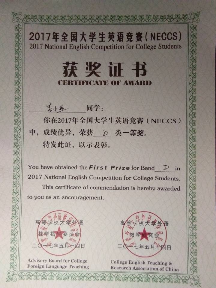 应用英语专业李小燕同学喜获2017年全国大学生英语竞赛(NECCS)D类一等奖