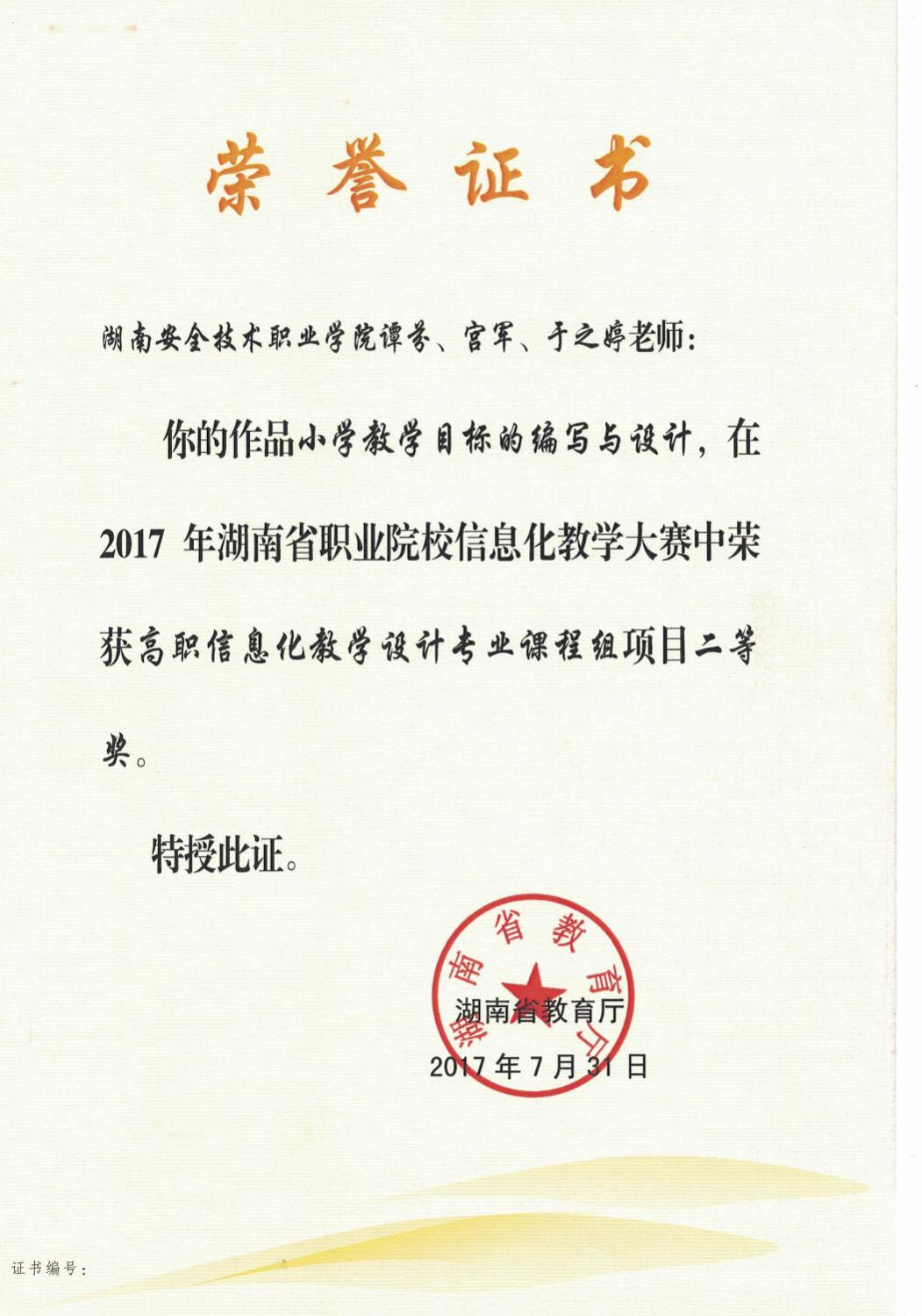 7月12日至17日,由湖南省教育厅主办的2017年湖南省职业院校信息化教学大赛在湖南化工职业技术学院隆重举行。现代商务学院应用英语专业教师谭芬老师带领团队成员宫军、于之婷老师两位老师共同完成的教学设计《小学教学目标的编写与设计》荣获高职组二等奖。应用英语专业一贯重视专业教师教学、科研等综合能力的培养和提升。通过参加本次比赛,提高了我专业教师教学能力、信息技术素养和团队合作精神。
