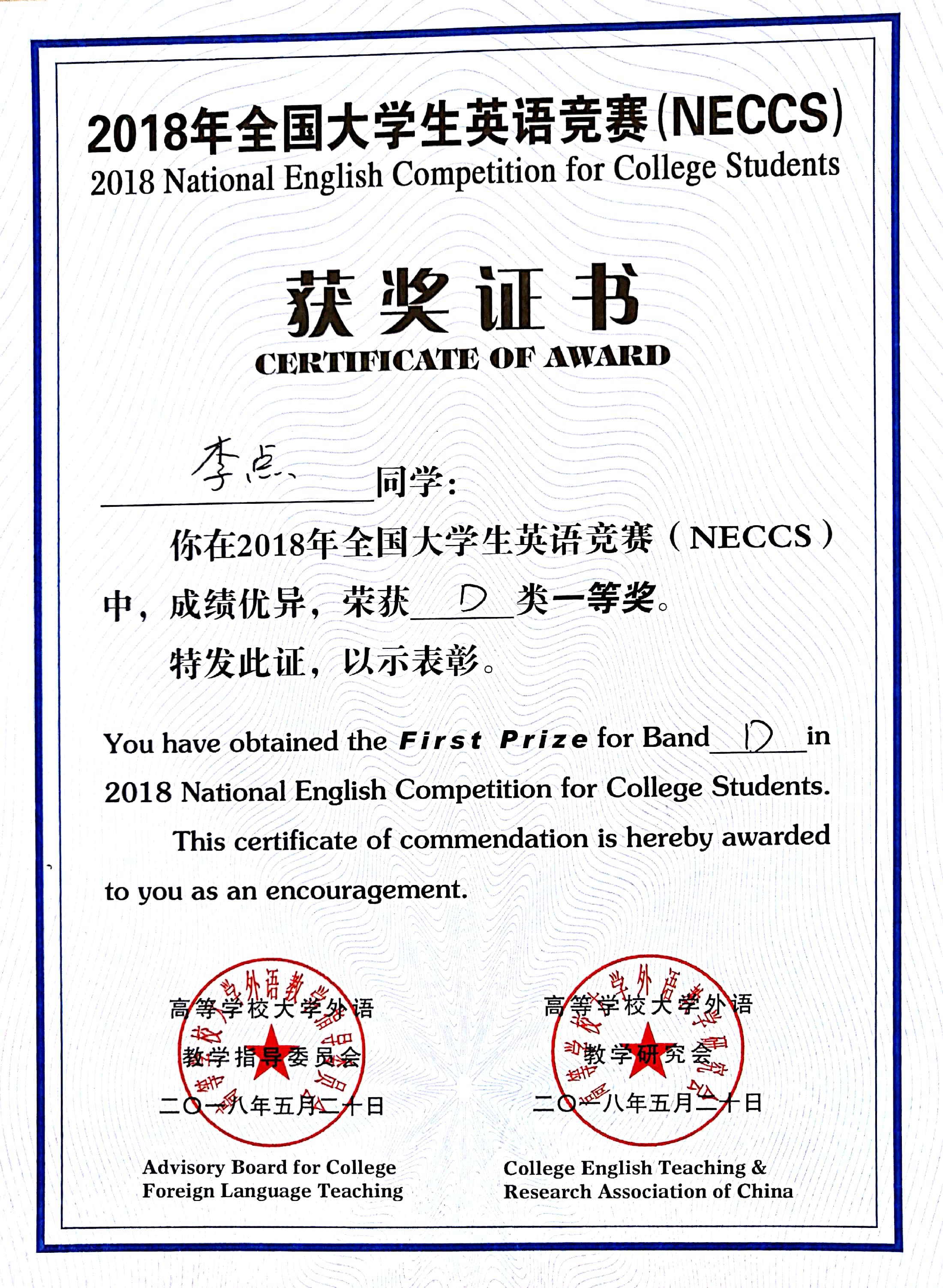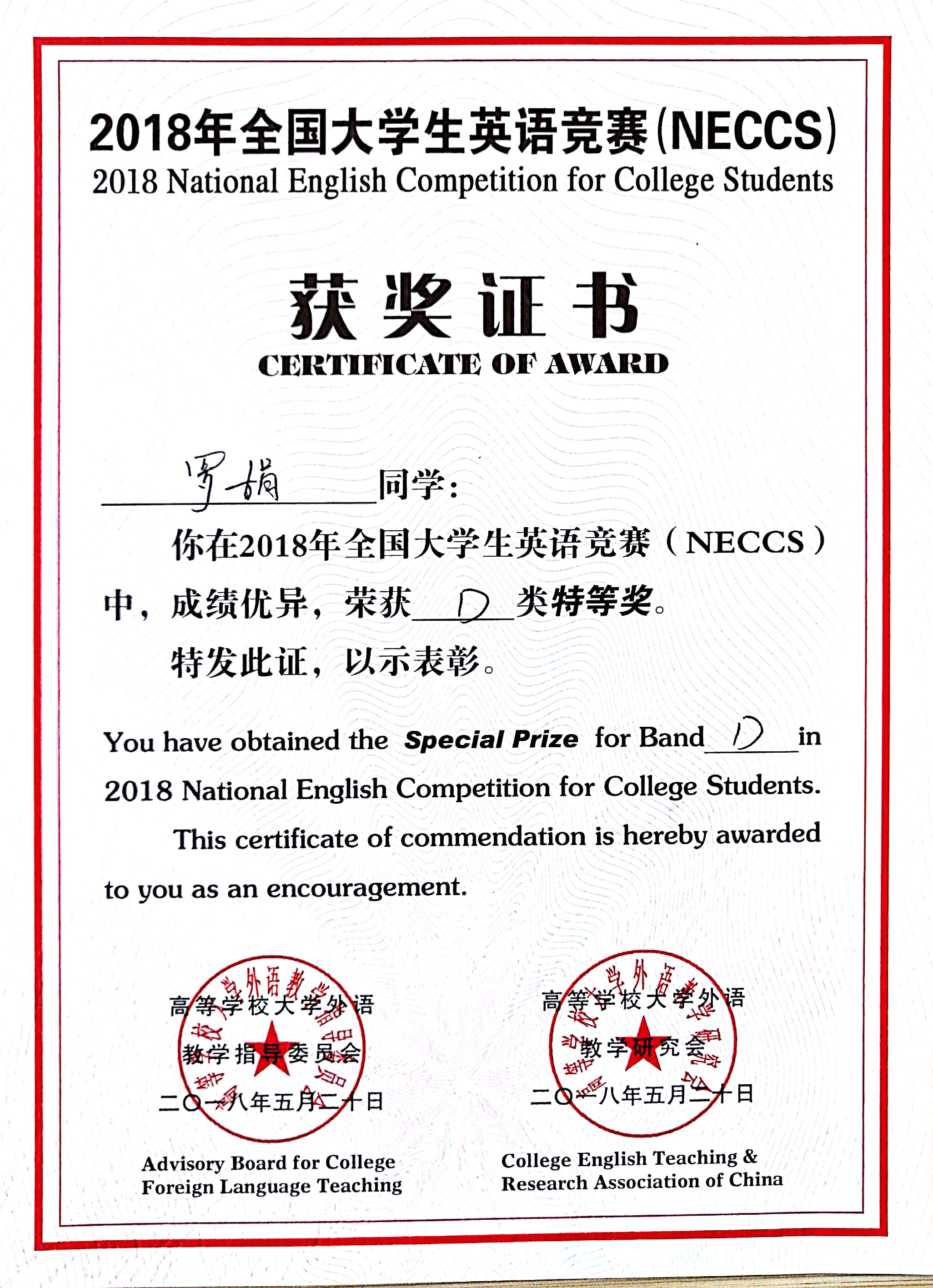 近日,在教育部高等学校大学外语教学指导委员会和高等学校大学外语教学研究会联合主办的2018年全国大学生英语竞赛(NECCS)湖南赛区决赛中,湖南安全技术职业学院应用英语专业教师范善颖老师指导的学生罗娟同学以优异的成绩获得D类特等奖,应用英语专业教师蒋志娟老师指导的李景芳同学,莫文卓老师指导的李点同学分获一等奖。
