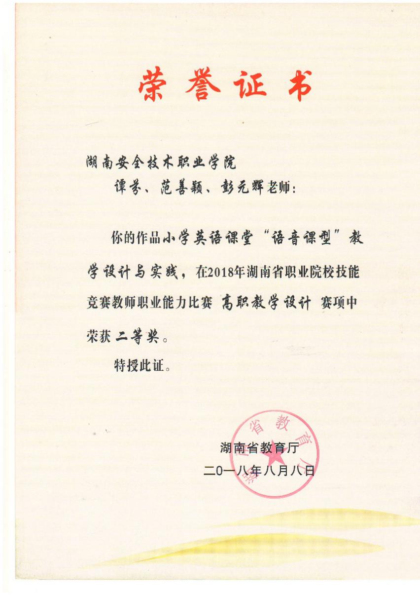 2018年湖南省职业院校信息化教学大赛调整为湖南省职业院校教师技能竞赛,比赛赛制在去年的基础上作了较大调整,难度也有提升,对职业院校教师综合素质、专业化水平和创新能力是一次全面检验。现代商务学院应用英语专业教师谭芬老师带领团队成员范善颖、彭元辉老师在校赛中脱颖而出,经过多轮校赛的打磨和精心备赛,在7月的省赛中荣获二等奖。