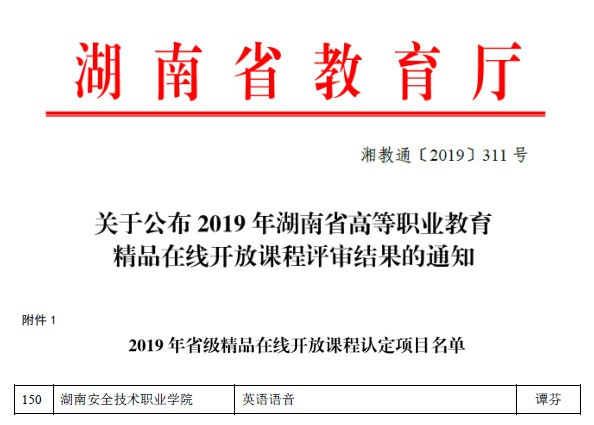 近日,湖南省教育厅发布了《关于公布2019年湖南省高等学校精品在线开放课程立项建设名单的通知》,现代商务学院应用英语专业教师谭芬老师带领范善颖等老师组成团队建设的课程《英语语音》获批立项。