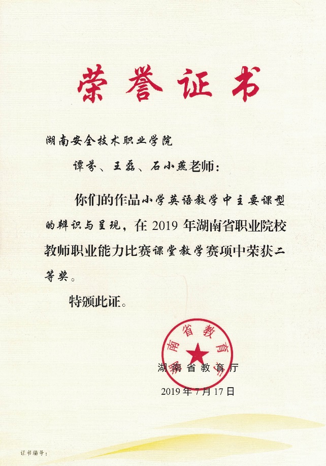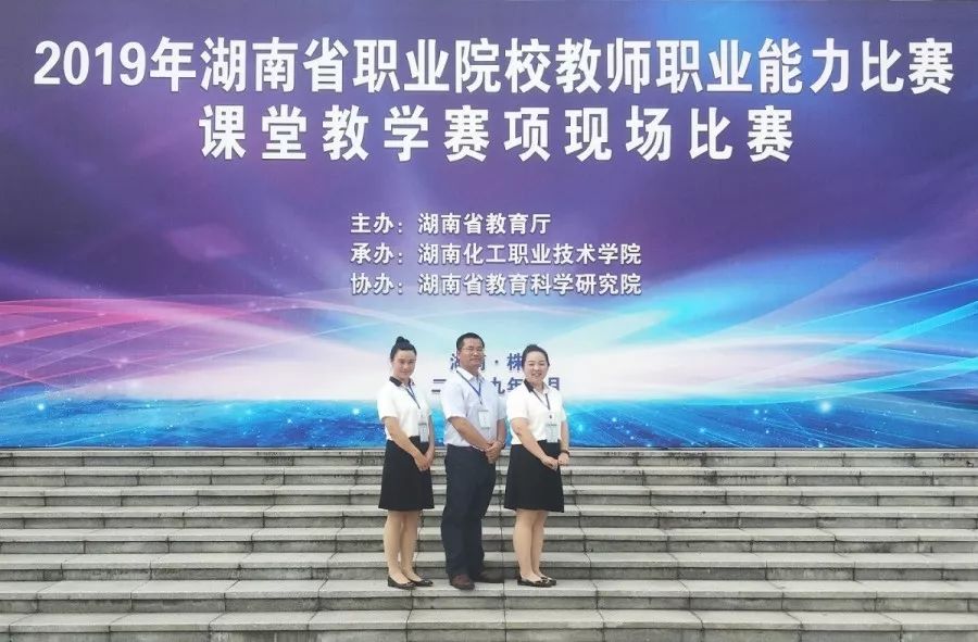 7月5日至7日,2019年湖南省职业院校教师职业能力比赛课堂教学赛项现场比赛在湖南化工职业技术学院举行。全省共209个团队进入现场比赛,其中高职组133个,中职组76个。现代商务学院应用英语专业教师谭芬老师带领团队教师王磊、石小燕老师经过精心准备、努力拼搏,最终荣获二等奖。